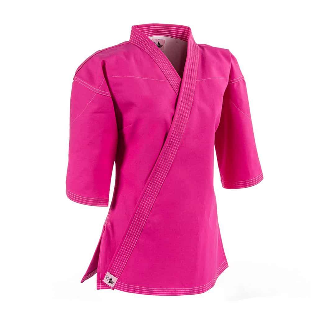 This bright pink 12 oz., 100% cotton canvas uniform is cut especially for female martial artists. The 3/4-length sleeves and extended side slits allow for a better range of motion during training, while front and back darts create the feminine fit. The unique tapered crossover style ensures the inner flap of the jacket is never seen, creating a cleaner look. Check out the “Learn More” link below for additional information. USA/Imported