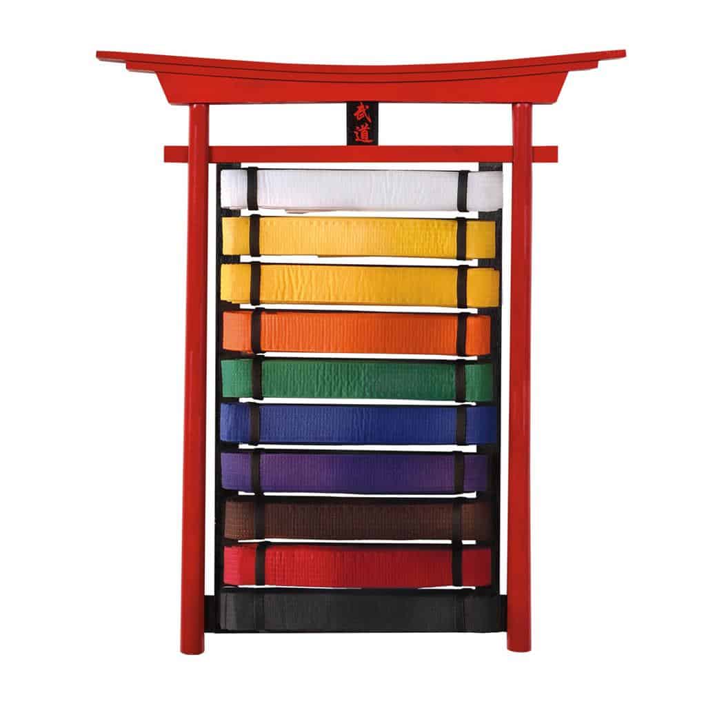 Display hard earned belts with this impressive stand. Belts are held in place with elastic straps on 1.875-inch slats. Made of solid wood with black and red semi-gloss finish. The hand-painted kanji adorning the top translates to “Budo.” Also available in a 6-level option. Belts sold separately. Imported