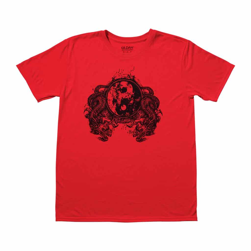 This shirt is an original Century design. Two snarling dragons curl around the yin-yang symbol. The sublimation printed design won’t crack and resists fading, even with multiple trips through the washer and dryer. 100% polyester.