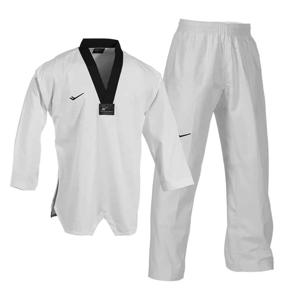 ProSpecs Dan Uniforms are perfect for taekwondo training. Available with both white collars for students and black collars for masters, these 65% poly & 35% cotton uniforms are lightweight. Both jacket and pants feature six rows of stitching at the cuffs, and the pants have an elastic waist band with internal drawstring. WTF approved.